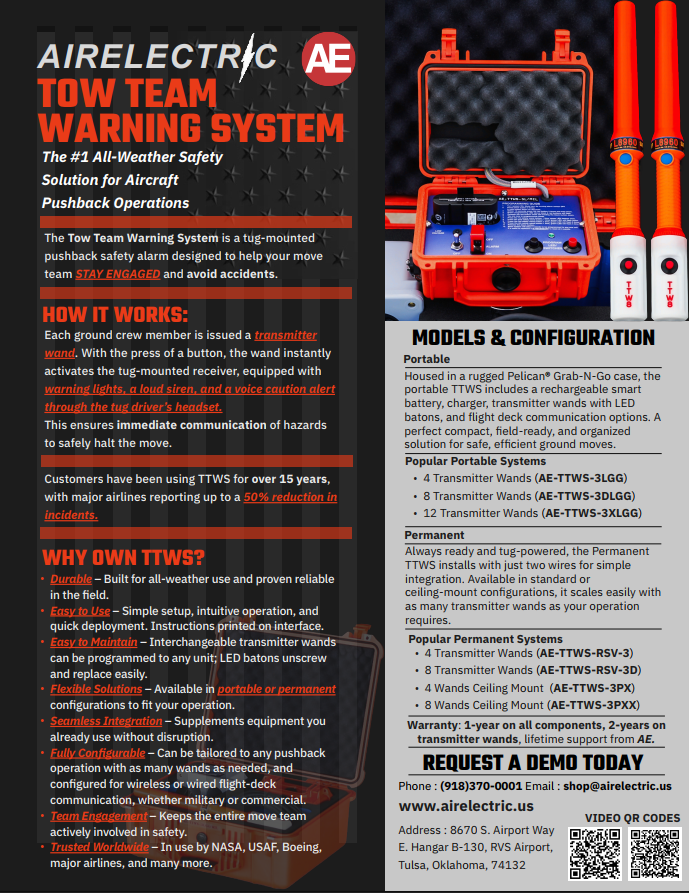 The Tow Team Warning System or TTWS® can save you time, costly aircraft repair bills as well as protect your companies reputation.